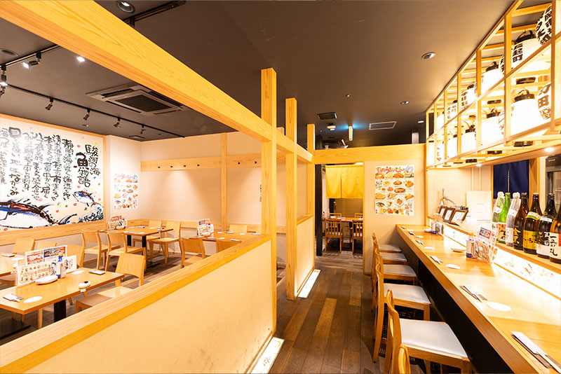 提灯が立ち並ぶ活気あふれるカウンターに、明るいながらも落ち着く解放感あるテーブル席をはじめ、個室もございます。